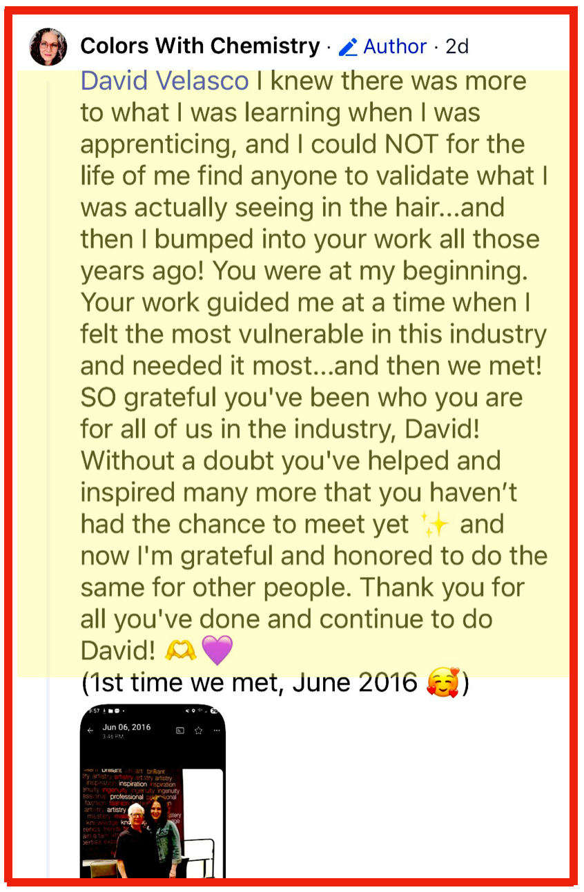 To my friends and colleagues in beauty, I have known and worked with David Velasco for many , many years. Whenever it comes to color, he is the one I call, Whenever I have a beauty professional who questions color I have them contact the industry leader, David. He makes learning color fun and easy. He has the full package of: practical experience , behind the chair knowledge and know how, he is a great teacher. His material that you can purchase on line has been a favorite of mine. Over the years anyone I have suggested purchasing to, has called or written and thanked me. David Velasco is outstanding representation or our industry. He is the color KING and deserves that title. You-da-man,